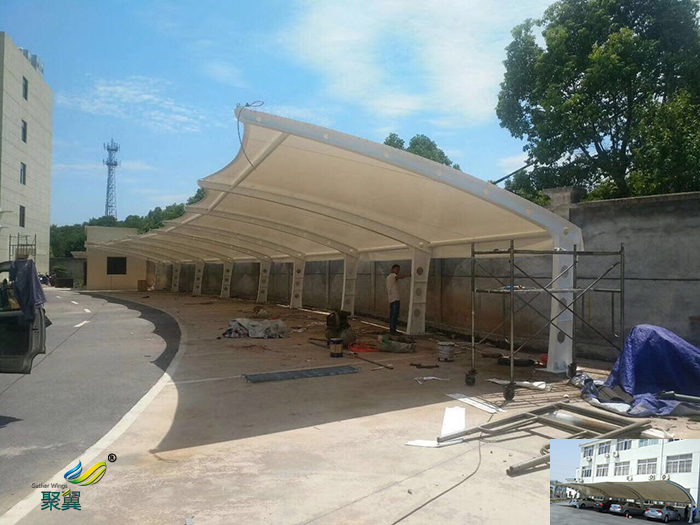 膜結(jié)構(gòu)車(chē)棚是建筑結(jié)構(gòu)中發(fā)展起來(lái)的一種形式,它以性能優(yōu)良的織物為材料,膜結(jié)構(gòu)建筑所采用的膜材具有卓越的阻燃性和耐高溫性,故能很好的滿(mǎn)足防火要求。由于結(jié)構(gòu)自重輕,又為柔性結(jié)構(gòu)且有較大變形能力,故抗震性能好。