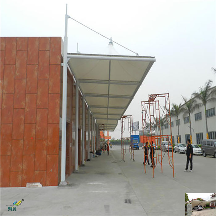 膜結(jié)構(gòu)車棚的篷布采用PVC/PVDF/PTFE/ETFE,而膜材的最大特點(diǎn)是強(qiáng)度高、耐久性好、防火難燃、自潔性好,不受紫外線影響,使用壽命長,一般15-30年。具有高透光率,透光率為13%,對熱能反射率73%,熱吸收量很少。正是因?yàn)檫@種劃時(shí)代的膜材料的發(fā)明,使膜結(jié)構(gòu)車棚成為現(xiàn)代化的永久建筑。