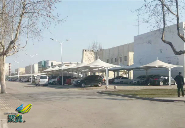 膜結(jié)構(gòu)車棚以聚酯纖維基布或PVDF、PVF、PTFE等不同的表面涂層,配以優(yōu)質(zhì)的PVC組成的具有穩(wěn)定的形狀, 并可承受一定載荷的建筑紡織品。膜結(jié)構(gòu)車棚同的表面涂層而異,一般可達(dá)成12—50年。