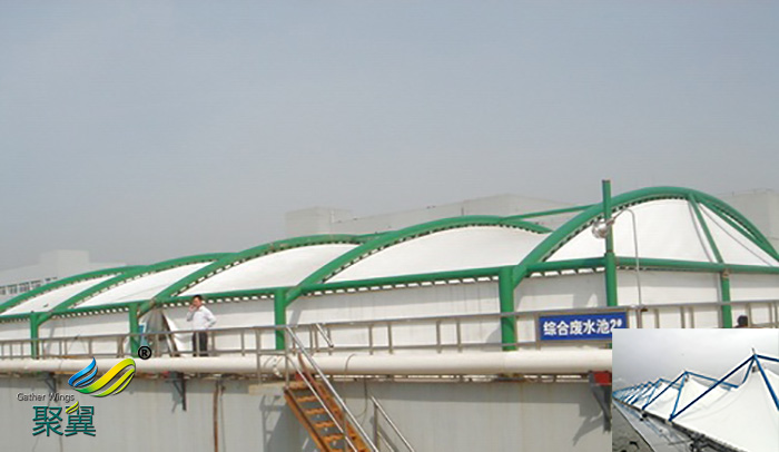 1.污水池加蓋防腐效果好,且不用考慮維護(hù)問題。反吊膜結(jié)構(gòu)的鋼材部分是在外面,只有膜材部分接觸污水池,如此便不會產(chǎn)生腐蝕問題,更加不用擔(dān)心維護(hù)問題。