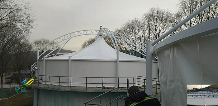 隨著廢氣成分的復(fù)雜多變,加蓋的方式也得到升級。當下市場常用的效果不錯的是反吊膜結(jié)構(gòu)加蓋,這種加蓋方式采用鋼構(gòu)在外面懸吊,不與池內(nèi)酸堿氣體接觸,從根本上解決鋼構(gòu)被腐蝕的現(xiàn)象,從而形成獨具特色的廢氣收集方案,在業(yè)界受到廣泛推崇。這種膜加蓋的方式比傳統(tǒng)的加蓋方式收集廢氣效果更好,而且保證廢氣達到排放標準。不僅膜材具有抗腐蝕特性,而且加蓋方式新穎,造型多變,可以根據(jù)客戶的實際需求和池體的結(jié)構(gòu)形式隨意設(shè)計,造型美觀。在使用年限方面,膜結(jié)構(gòu)加蓋膜材質(zhì)保15年,鋼構(gòu)在50年,將反吊膜結(jié)構(gòu)的優(yōu)勢最大化展現(xiàn)。