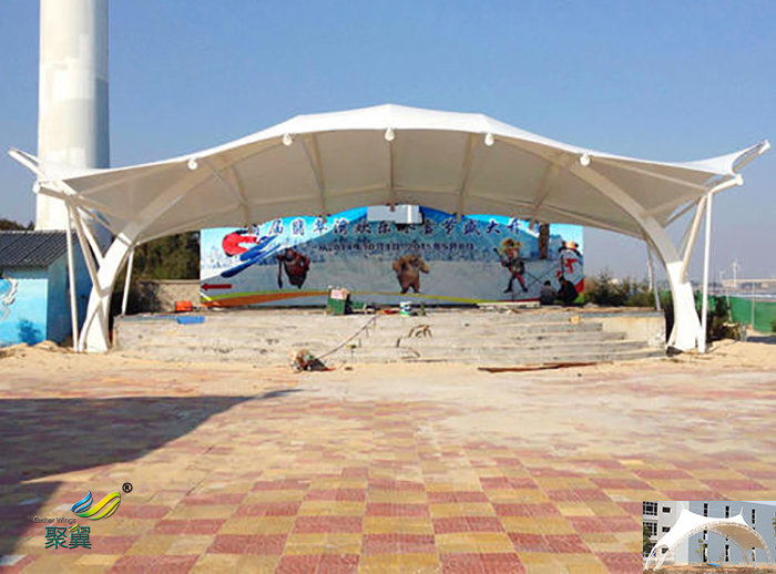 2、張拉舞臺膜結(jié)構(gòu)挑選膜面的形狀和材料時要考慮到一切可能的氣候狀況,并盡可能使用建筑自身特性等方法來削減能量的損耗。
