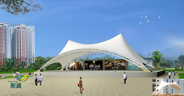 二、舞臺膜結構造型獨特:所用膜材是柔性材料、整體造型更容易實現獨特性,我們可以為客戶做多個造型方案由客戶選擇,定制化的流程可以保證舞臺自由空間曲面多變化。