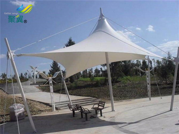 膜結構是一種建筑與結構完美結合的結構體系;它是用高強度柔性薄膜材料與支撐體系相結合形成具有一定剛度的穩(wěn)定曲面,能承受一定外荷載的空間結構形式;這種結構形式特別適用于大型體育場館、人口廊道、小品、公眾休閑娛樂廣場、展覽會場、購物中心等領域。用于膜結構中的膜材是一種具有高強度、柔韌性好的薄膜材料;中心的織物基材分為聚酯纖維及玻璃纖維,而作為涂層材使用的樹脂有聚氯乙烯樹脂(PVC),硅酮及聚四氟乙烯樹脂(PTFE),它具有輕質、柔韌、厚度小、重量輕、透光性好;對自然光有反射、吸收和透射能力;它不燃、難燃或阻燃;具有耐久、防火、氣密良好等特性;表面經氟素處理(涂覆PVF或PVDF)的膜材、自身不發(fā)粘、有很好的自潔性能。