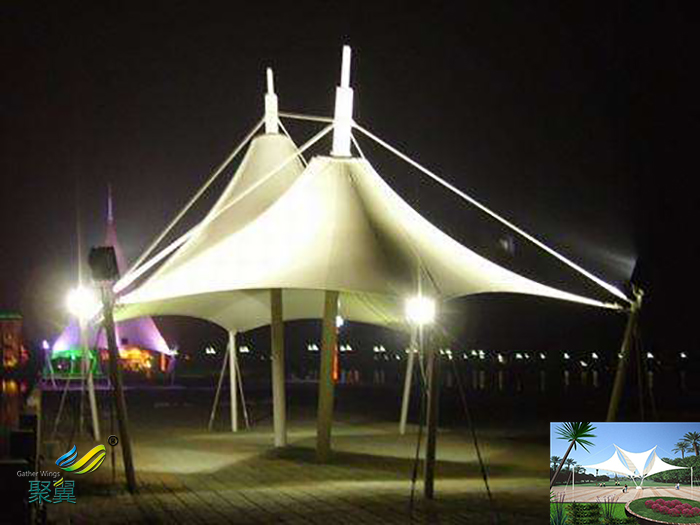 景觀張拉膜作為一種建筑體系所具有的特性主要取決于其獨特的形態(tài)及膜材本身的性能。恰由于此,用膜結(jié)構(gòu)可以創(chuàng)造出傳統(tǒng)建筑體系無法實現(xiàn)的設(shè)計方案。