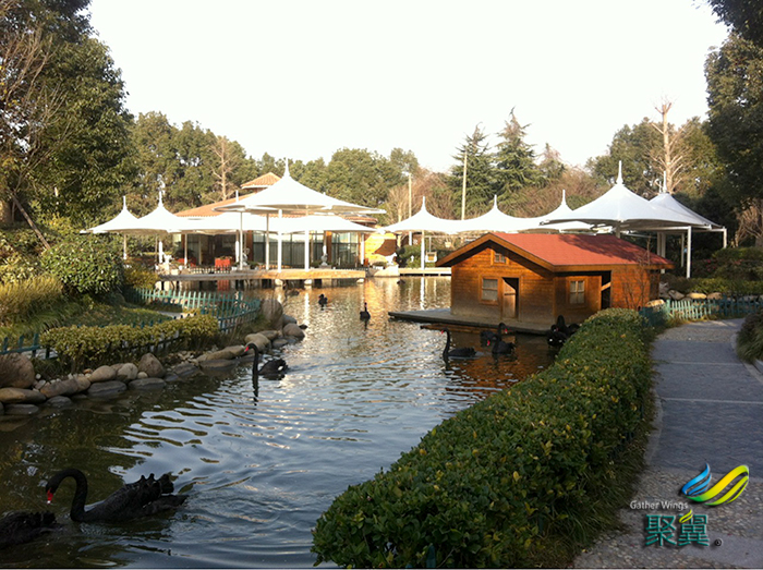園林景觀膜結(jié)構(gòu)廳不僅防風(fēng)雨、防日曬、防紫外線,而且園林景觀膜結(jié)構(gòu)廳輕巧、別致,簡練,明快,剛度和矯捷性,是力與美的完美連絡(luò)。 園林景觀膜結(jié)構(gòu)廳與湖渾然一體,潺潺水聲,緩緩律動,與湖內(nèi)的植物構(gòu)及群鴨溪水形成一個(gè)充滿生機(jī)的靈動空間。