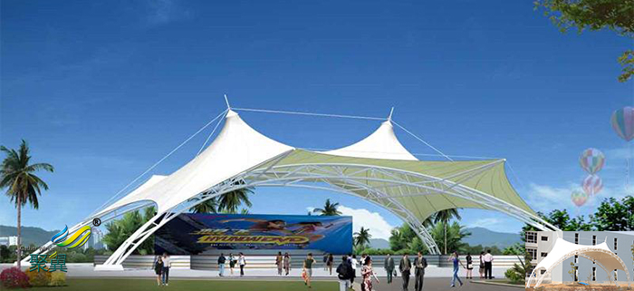 1、舞臺膜結(jié)構(gòu)雕塑感: 舞臺張拉膜結(jié)構(gòu)的共同曲面外形使其具有激烈的雕塑感,膜面經(jīng)過張力到達自平衡。