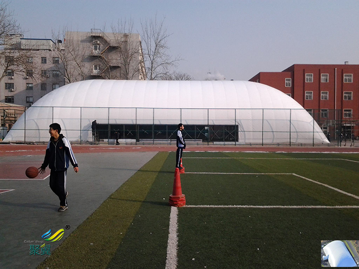 1. 氣承式膜結(jié)構(gòu):膜面本身不形成封閉曲面,其周邊固定于剛性邊界或基礎(chǔ),密閉空間由膜面、四周封閉邊界與室內(nèi)地面形成。