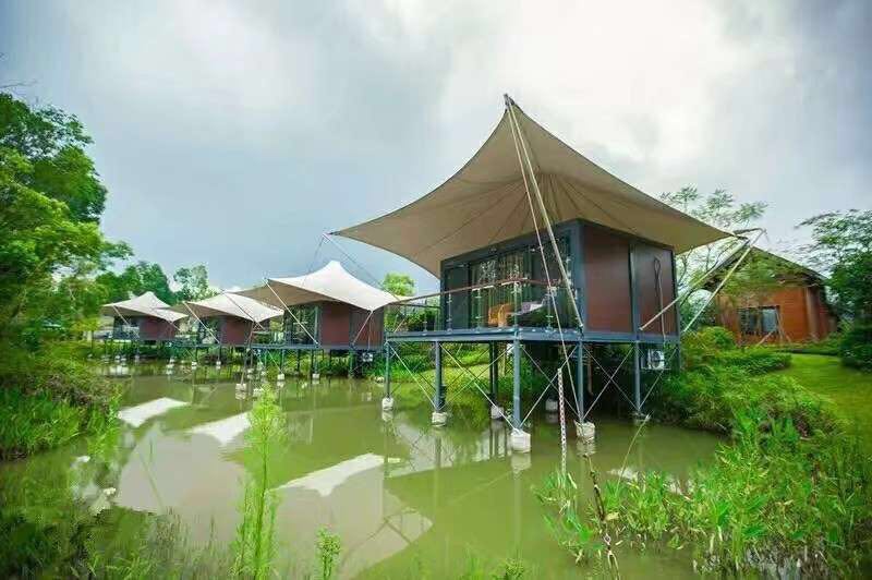戶外酒店屋頂張拉膜結(jié)構(gòu)選用了PTEF膜材,無論是美觀還是使用性能,PTFE膜結(jié)構(gòu)都是非常合適的選擇。PTFE膜結(jié)構(gòu)有著非常高的自潔性能又防火,戶外酒店屋頂張拉膜結(jié)構(gòu)是以二氧化鈦與聚酯纖維而成,具有高強度透光率,熱吸收量很少。同時戶外酒店屋頂張拉膜結(jié)構(gòu)能隔音吸音、隔熱防潮、不變形。