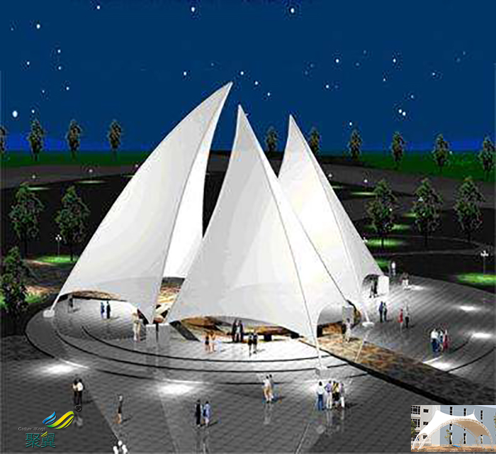 膜結(jié)構(gòu)看臺無論室內(nèi)還是室外這種雕塑般的質(zhì)感都令人激動。夜晚的燈光使膜結(jié)構(gòu)具有強烈的雕塑感張拉膜結(jié)構(gòu)