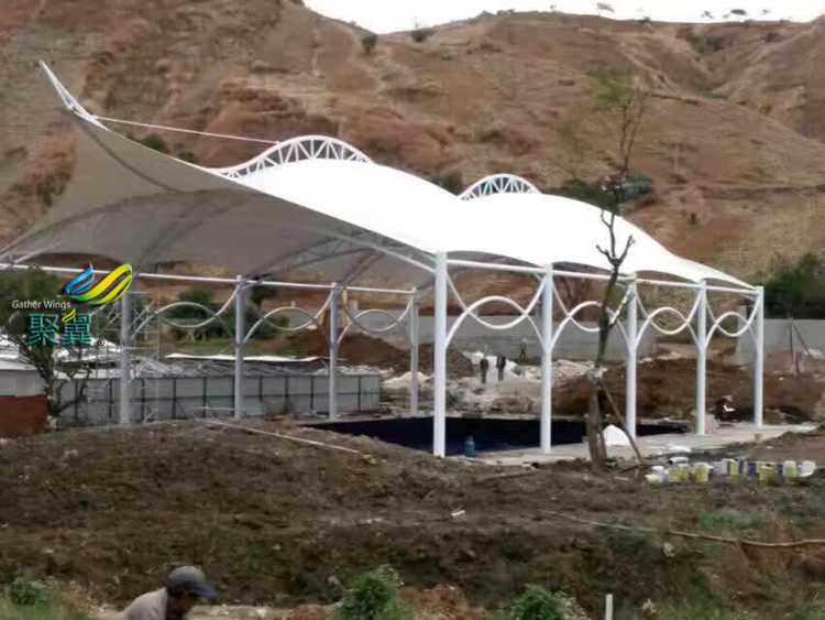 根據(jù)場地條件結(jié)合客戶的需求設(shè)計出各類個性化的5人球場膜結(jié)構(gòu)頂棚,超強隔熱能力,造型設(shè)計時尚美觀,有良好的遮陽擋雨的功效,自潔性能好,在造型及配套設(shè)施等方面不推陳出新,以滿足客戶要求。