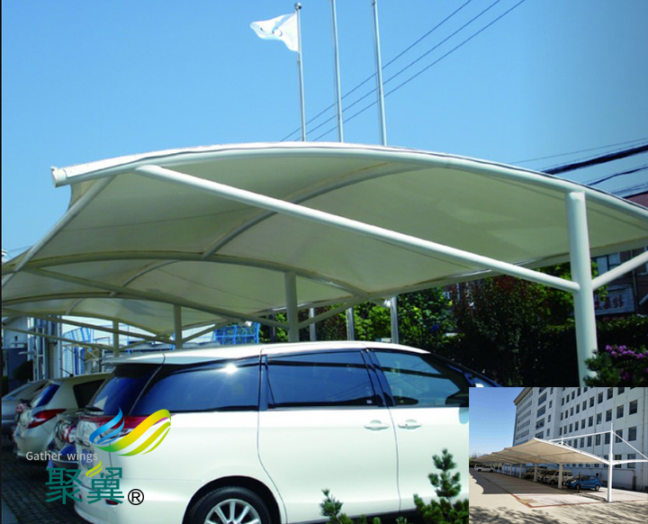 膜結(jié)構(gòu)停車棚自潔性:膜建筑中采用具有防護(hù)涂層的膜材,可使建筑具有良好的自潔效果,同時(shí)保證建筑的使用壽命。PTFE膜材和經(jīng)過特殊表面處理的PVC膜材具有很好的自潔性能,雨水會在其表面聚成水珠流下,使膜結(jié)構(gòu)停車棚膜材表面得到自然清洗。