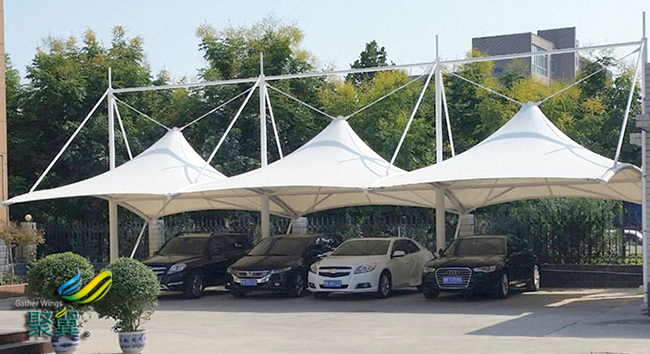 張拉膜結構車棚是通過拉索將膜材料張拉手在結構上形成的構造形式,膜的表面通過自身曲率變化達到內外力平衡。