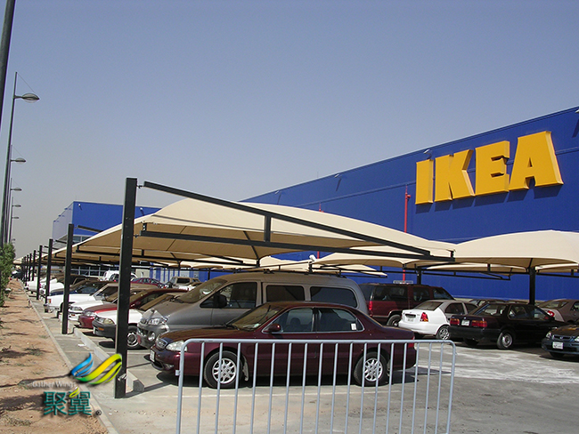 膜結(jié)構(gòu)車棚用4分(12.7毫米)鋼管,按膜結(jié)構(gòu)車棚中棚跨度彎成弧形,作為拱桿。拱桿間距1米,10支鋼管為一組,底腳用兩根直徑14毫米鋼筋焊接成一體,中部用4分鋼管焊成橫梁??蓡为毷褂茫部蓭捉M連成一個較大型的膜結(jié)構(gòu)車棚中棚。
