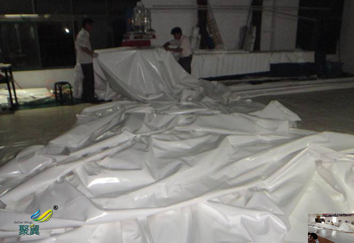 PTFE 膜是在超細玻璃纖維織物上,涂以聚四氟乙烯樹脂而成的材料。PTFE 膜最大的特點就是耐久性、防火性與防污性高。但 PTFE 膜與 PVC 膜比較,材料費與加工費高,且柔軟性低,在施工上為避免玻璃纖維被折斷,須有專用工具與施工技術(shù)。