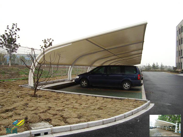 膜結(jié)構(gòu)車棚遮陽擋雨實(shí)用,應(yīng)用范圍: 停車棚膜結(jié)構(gòu)一般用于停放自行車、電動車以及汽車,起到為車子遮陽、防雨雪功能。