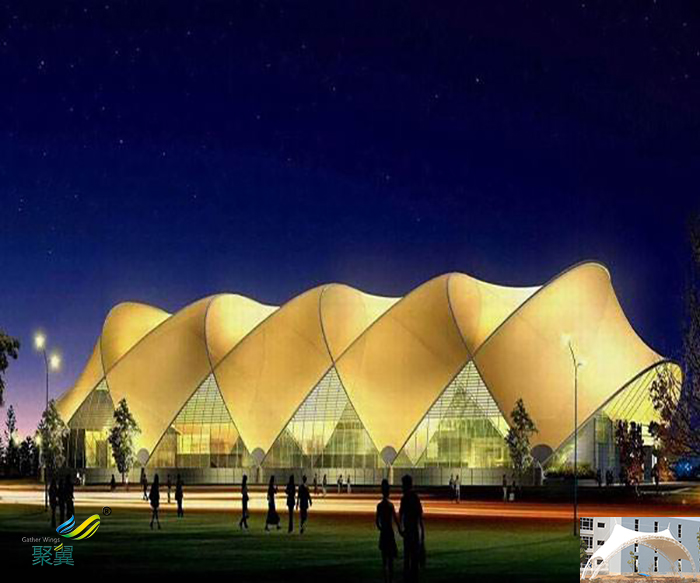 三、舞臺(tái)膜結(jié)構(gòu)景觀(guān)效應(yīng)性:文藝舞臺(tái)膜結(jié)構(gòu)新穎別致的膜建筑造型與傳統(tǒng)建筑相比可以突出其獨(dú)特性,而且也不會(huì)與周?chē)h(huán)境顯得突兀,整體造型適時(shí)適地融合周邊景致,與周?chē)h(huán)境相適應(yīng),相得益彰。特別是結(jié)合夜間的燈光設(shè)計(jì),會(huì)呈現(xiàn)出一個(gè)如夢(mèng)境般的風(fēng)景線(xiàn)。