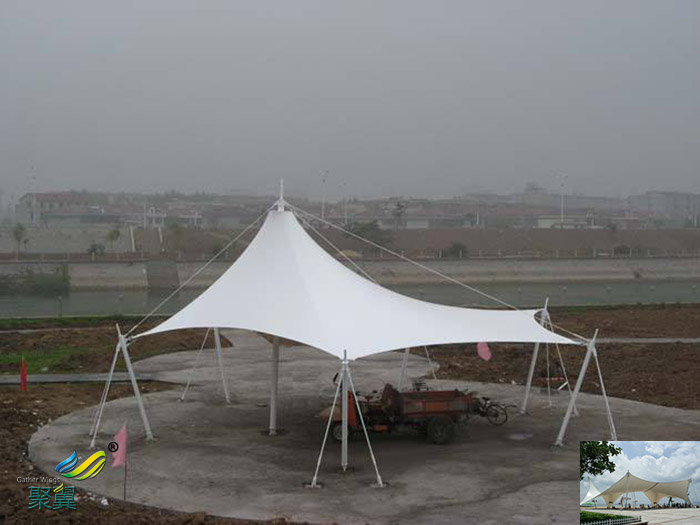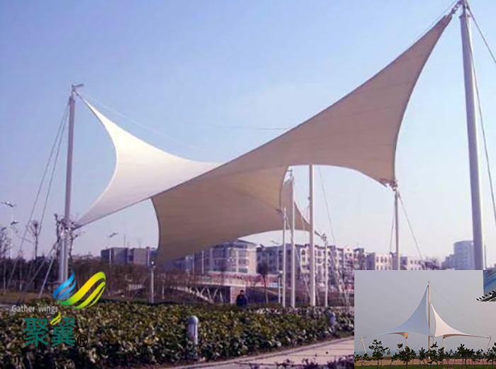 2. 景觀張拉膜結(jié)構(gòu)藝術(shù)性:除了通常雨蓬不行比較的實用、經(jīng)用、遮風(fēng)擋雨的功能外,膜結(jié)構(gòu)雨蓬更是一座雕塑,一件藝術(shù)品,給人美的視覺享受。其柔美,其曲線,其剛?cè)岵?,其豐富外型,其潔白無瑕,讓人眼前一亮,回味悠長。