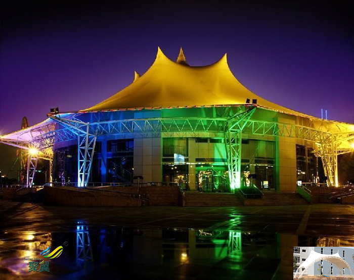 膜結(jié)構(gòu)看臺無論室內(nèi)還是室外這種雕塑般的質(zhì)感都令人激動。夜晚的燈光使膜結(jié)構(gòu)具有強烈的雕塑感張拉膜結(jié)構(gòu)