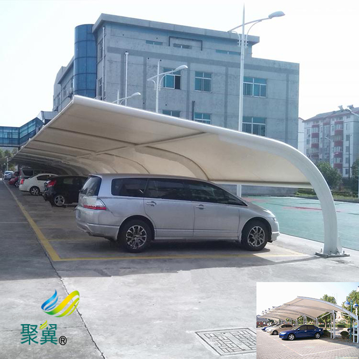 膜結(jié)構(gòu)停車棚主要采用鋼材、鋼索和膜材料。使用鋼材作為主要支撐構(gòu)件,配合多種高強(qiáng)度薄膜材料通過一定的方式使其產(chǎn)生張力以形成某種空間形狀,這種空間結(jié)構(gòu)可以承受的一定外荷載作用。