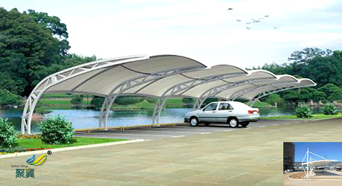 膜結(jié)構(gòu)車棚,是以建筑織物 膜結(jié)構(gòu)車棚定制,即膜材料為張拉主體 膜結(jié)構(gòu)車棚特點,與支撐構(gòu)件或拉索共同組成的結(jié)構(gòu)體系,它以其新穎獨特的建筑造型,良好的受力特點—成為大跨度空間結(jié)構(gòu)的主要形式之一。膜材料是指聚酯纖維基布或PVDF、PVF、PTFE等不同的表面涂層,配以優(yōu)質(zhì)的PVC組成的具有穩(wěn)定的形態(tài) 膜結(jié)構(gòu)車棚,并可承受一定載荷的建筑紡織品。它的壽命因不同的表面涂層而異,一般可達成10-20年。
